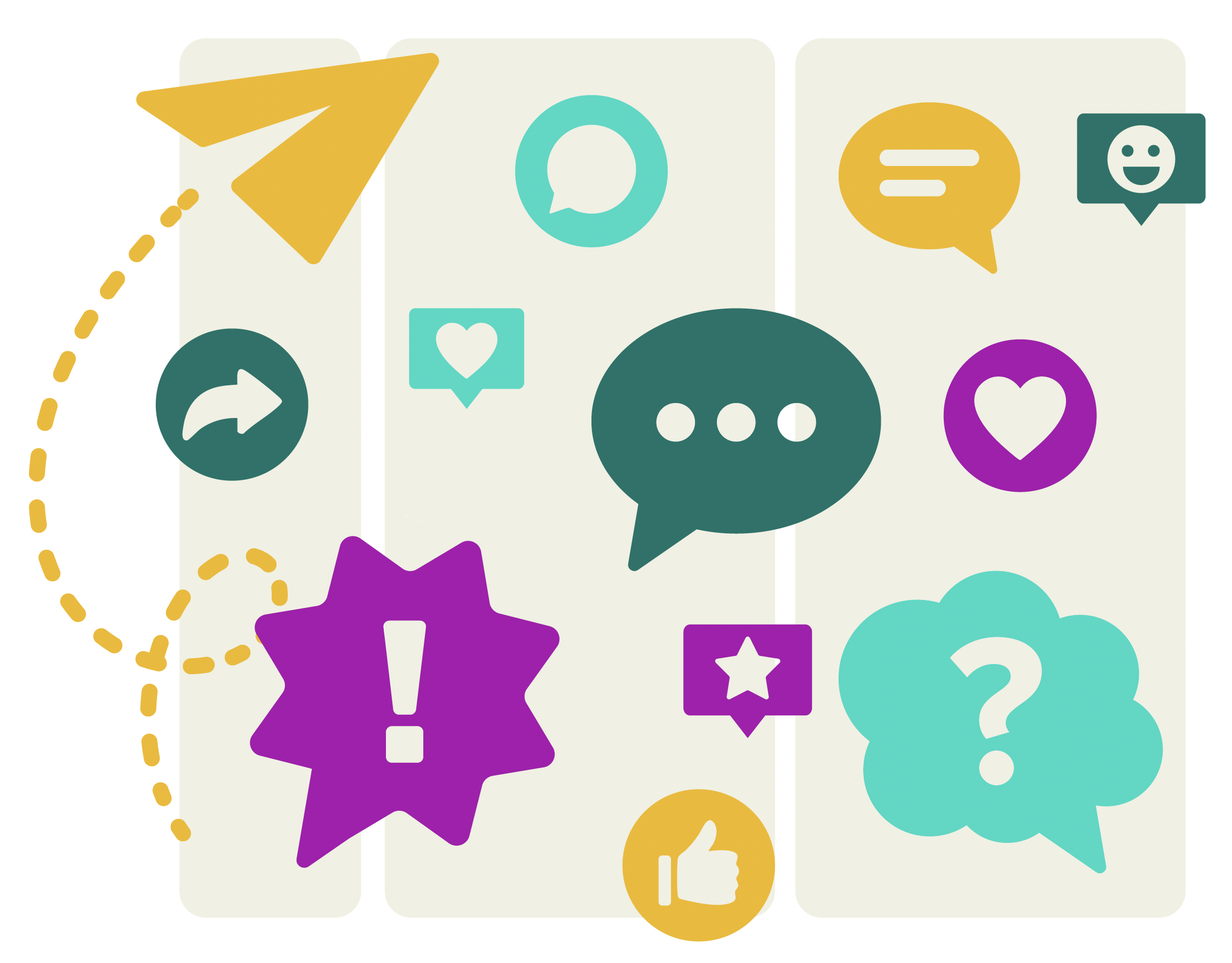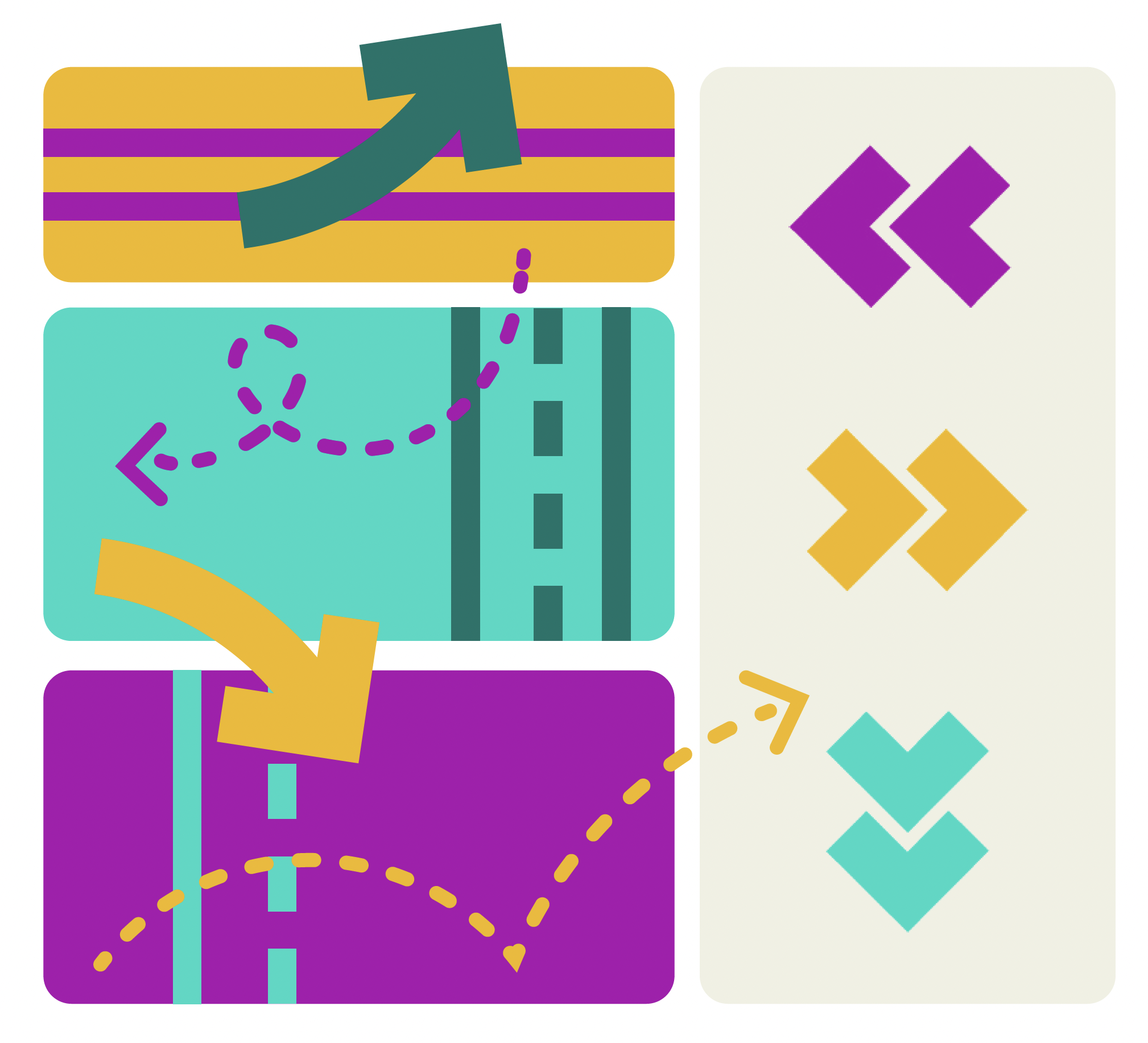 Geometric shapes referencing pathways, roads/navigation, communication, and social media